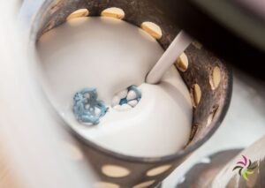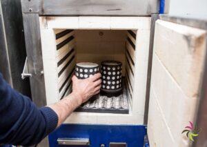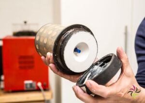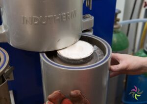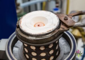 The heat then causes the wax to melt away, creating a negative impression in the plaster. Then the oven is brought to the desired casting temperature. The precisely calculated amount of metal is added. Once the metal has melted, the tube coming out of the oven is placed in a holder. The space below is then vacuum sucked. The liquid metal is poured into the cylinder, the vacuum sucks the liquid metal well into the mould. After casting, the whole thing has to rest for a while.
