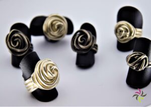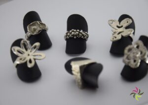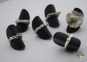 As jewellers/designers, we receive rough pieces of silver or gold or rose gold or white gold which we then finish by sanding, filing, polishing and even crowning them with extra stones (zirconia, diamonds or other …).
